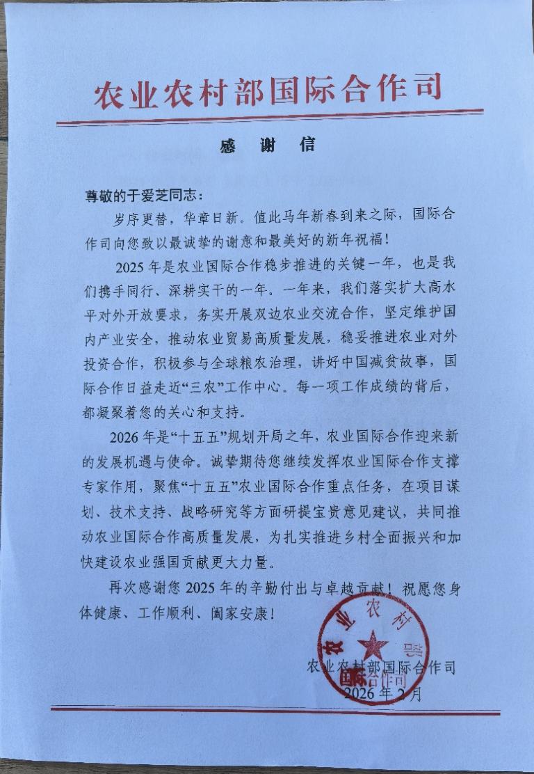 農(nóng)業(yè)農(nóng)村部國際合作司感謝信指出,2025年是我國農(nóng)業(yè)國際合作穩(wěn)步推進的關(guān)鍵一年,各項工作成績的取得,凝聚著于愛芝教授等專家的智慧與付出。2026年是“十五五”規(guī)劃開局之年,農(nóng)業(yè)國際合作迎來新的發(fā)展機遇與使命,農(nóng)業(yè)農(nóng)村部國際合作司誠摯期待于愛芝教授繼續(xù)發(fā)揮農(nóng)業(yè)國際合作支撐專家作用,聚焦“十五五”農(nóng)業(yè)國際合作重點任務,在項目謀劃、技術(shù)支持、戰(zhàn)略研究等方面提供寶貴意見建議,共同推動農(nóng)業(yè)國際合作高質(zhì)量發(fā)展,為扎實推進鄉(xiāng)村全面振興和加快建設農(nóng)業(yè)強國貢獻更大力量。